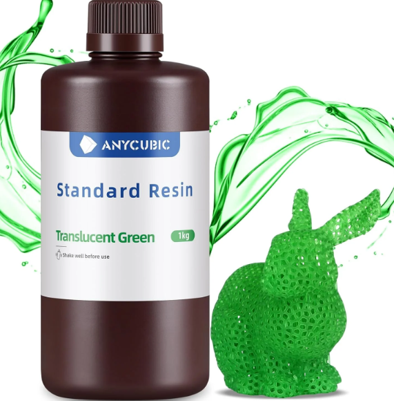 Yarı şeffaf yeşil renkli Anycubic reçine, 355 ila 410 nm UV dalga boyları için SLA ve DLP teknolojisine sahip 3D yazıcılarda kullanılmak üzere tasarlanmış fotoreaktif bir reçinedir. Anycubic marka reçineler, düşük koku, sıfır VOC emisyonu ve düşük çekme özellikleri (%3,72 - 4,24) ile karakterize edilir.